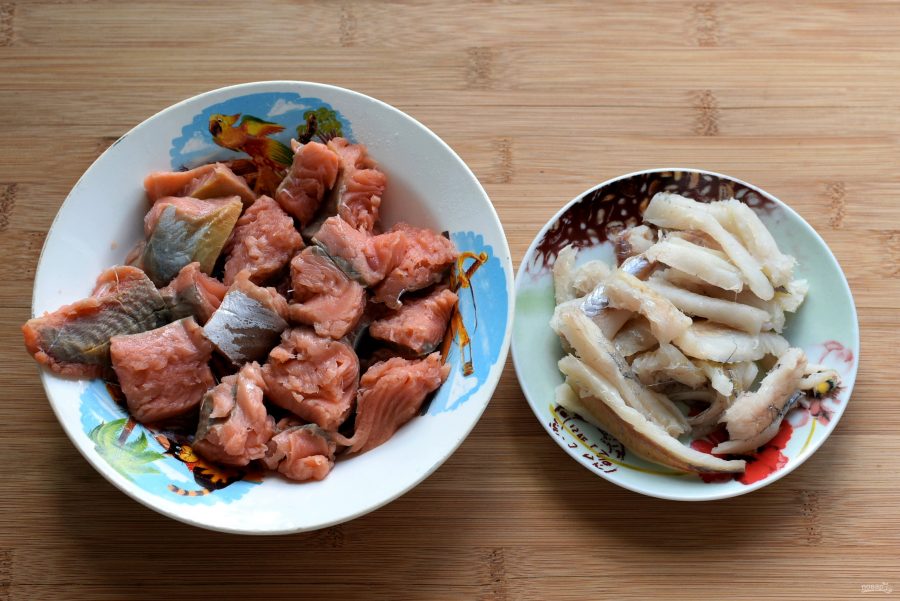 Разделайте рыбу на чистое филе без кожи, нарежьте небольшими кусочками и посолите.