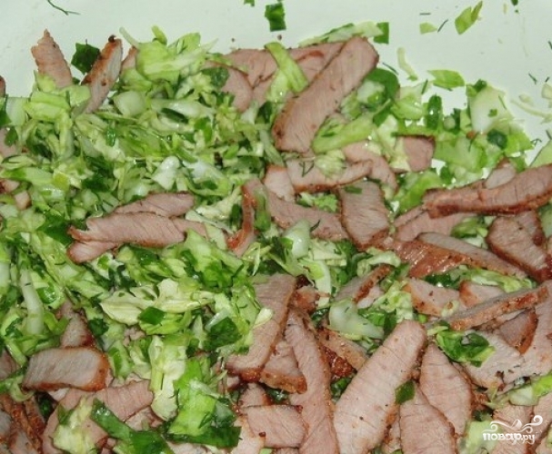 Капусту шинкуем.Режем зелень, перемешиваем с капустой.Остывшее мясо нарезаем ломтиками.Добавляем к капусте.