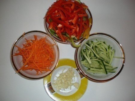 2. Морковь и перец нарезать соломкой, пассировать на растительном масле до мягкости, но так, чтобы перец не потерял цвет. Зубчики чеснока нарезать на мелкие кусочки, и бросить в конце жарки моркови и перца.
