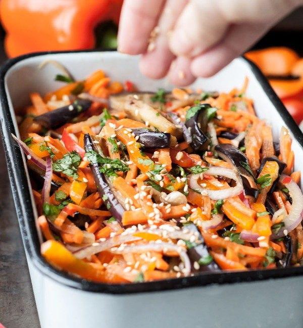 Острый хрустящий азиатский салат из баклажанов, сладкого перца, моркови, красного лука с добавлением уксуса, семян кунжута, чеснока и кинзы.