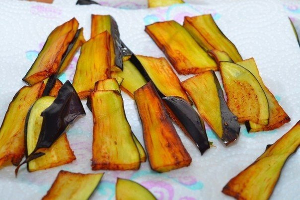 6. Выложите готовые баклажаны на бумажные полотенца, чтобы полотенце впитало лишнее масло.