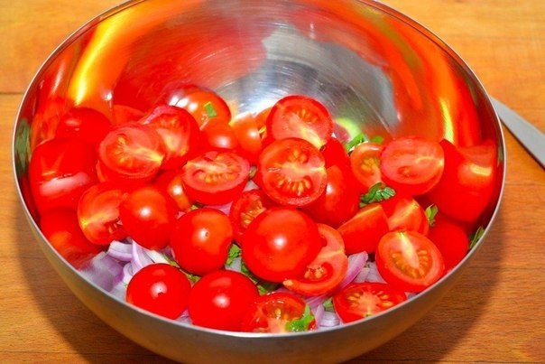 9. Сложите лук, базилик, перчик и помидорки (порезанные пополам) в миску.
