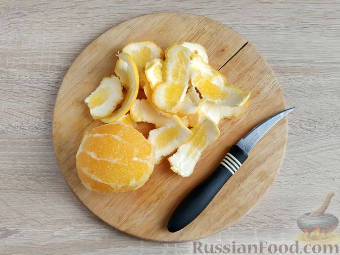 С апельсина срежьте кожуру, захватывая по максимум всю белую часть под тоненьким оранжевым слоем цедры.