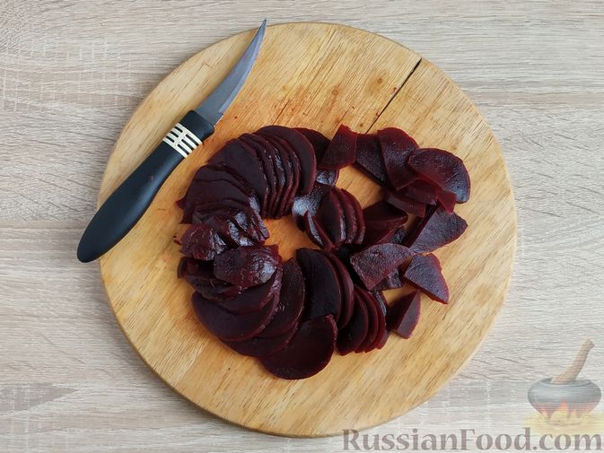 Нарежьте свеклу тонкими ломтиками.