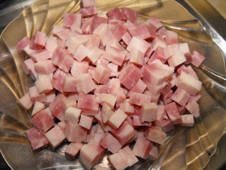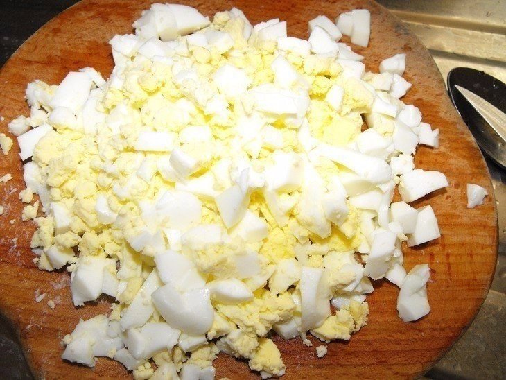 Отварить яйца, почистить и нарезать мелким кубиком.