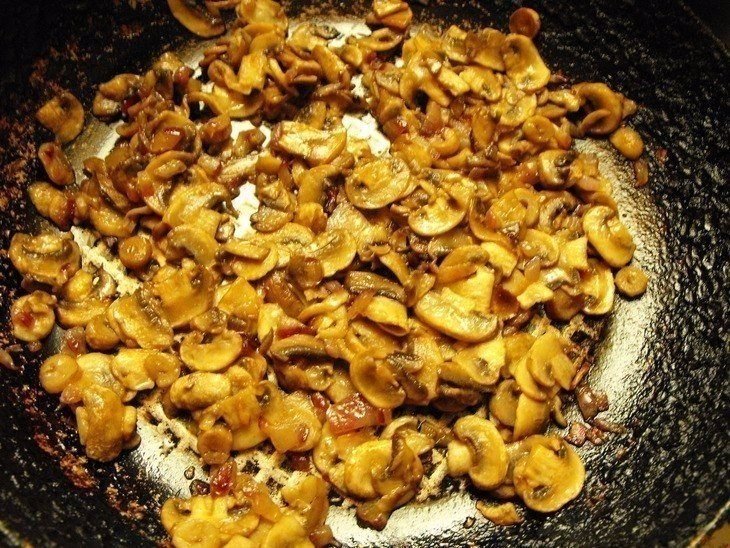 Лук и шампиньоны нарезать и обжарить на небольшом количестве растительного масла.