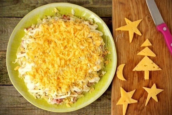 4. Твёрдый сыр нарежьте пластинками и вырежьте из них звёзды, месяц и ёлочку. Остальной сыр и обрезки натрите (крупная тёрка)- это следующий слой салата, полейте его майонезом.