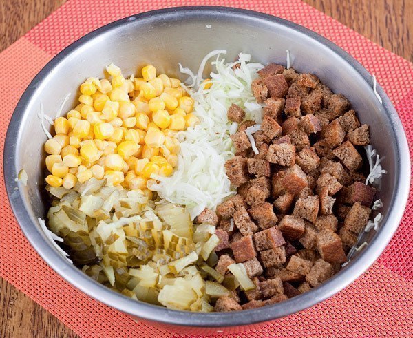 Смешиваем все ингредиенты: капуста, соленые огурцы, сухарики, кукуруза.