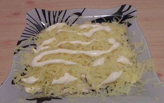 Отварите картофель в мундирах. Очистите его от кожуры и натрите на крупной терке. Измельченный картофель выложите на куриное филе. Снова посолите и смажьте слой майонезом.