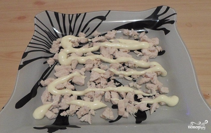 Куриное филе отварите и порежьте на мелкие кусочки. Выложите мясо на тарелку, равномерно разровняв его по всей поверхности. Посолите и щедро полейте майонезом, чтобы курица не была сухой.
