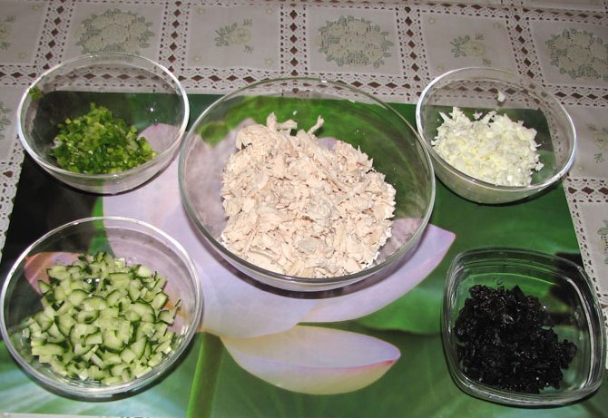 Нарезать белки, куриную грудку, огурец, чернослив.