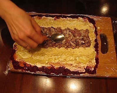 Не свеклу выложите морковь. Слой моркови должен быть немного меньше (в основном, уже) слоя свеклы.