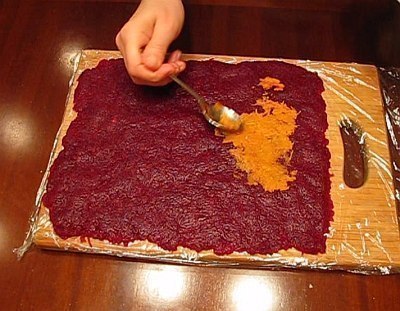 Натертую свеклу отожмите и выложите слоем на пищевую пленку