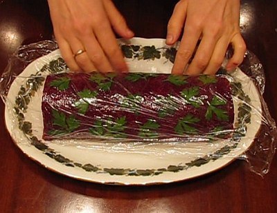 Рулет в пленке уберите в холодильник на 2 – 3 часа, а лучше на ночь, настояться.