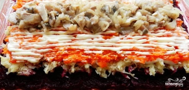 1. Перед приготовлением, как и полагается, отварим картошку, морковь и свеклу. Остудим. Стол застилаем пищевой пленкой, выкладываем первый слой из измельченной вареной свеклы. Сверху - слой тертой на терке отварной картошки. Смажем картошку майонезом.