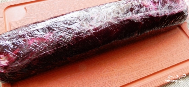 3. Дальше аккуратно поднимаем края пленки так, чтобы края начали загибаться. Надо, чтобы края как бы "захлопнулись" с двух сторон, скрывая селедку внутри. Я обычно делаю с одной стороны пленки надрез, и протягиваю сквозь него второй край. Так, можно с легкостью свернуть тугой рулет. Затягиваем края, и в таком "тугом" виде держим салат в холодильнике хотя бы два часа.