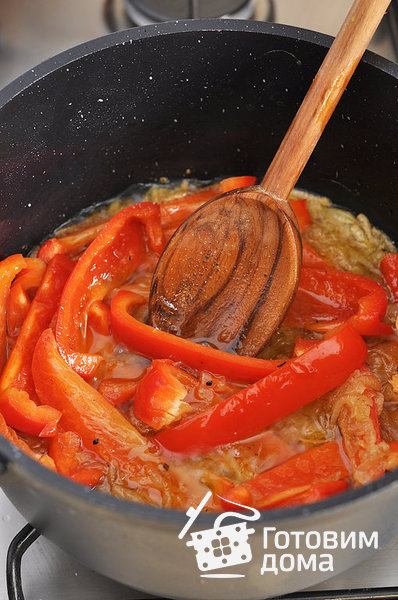 Добавить болгарский перец и обжарить, помешивая, около 5 минут.