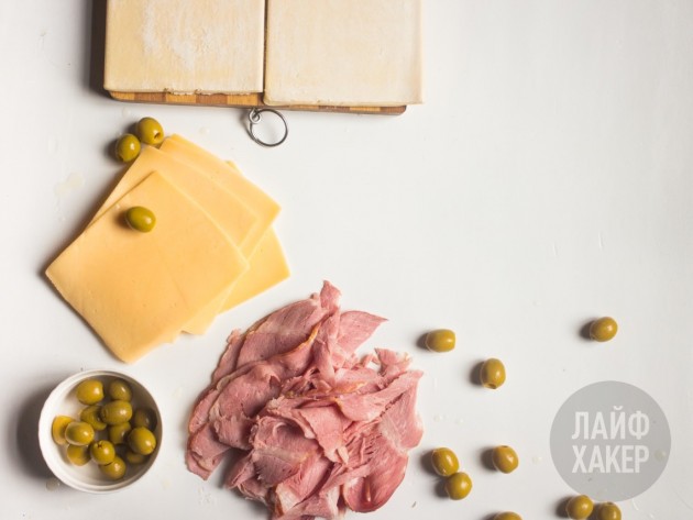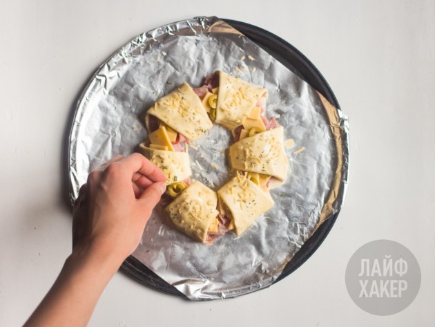 Ветчину нарежьте максимально тонко, сыр натрите или нарежьте на некрупные кусочки вместе с оливками. Сложите треугольники теста в кольцо внахлёст на застеленном пергаментом противне. Распределите начинку в центре кольца и подверните верхушки треугольников под их основания, частично закрывая начинку.