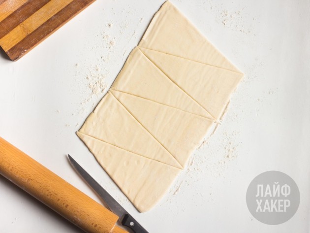 Разумеется, мы не будем браться за приготовление слоёного теста собственноручно, дабы не убивать на это драгоценное время. Возьмите пласт уже готового теста, слегка раскатайте его (примерно до 3 мм толщиной) и нарежьте на шесть треугольников.