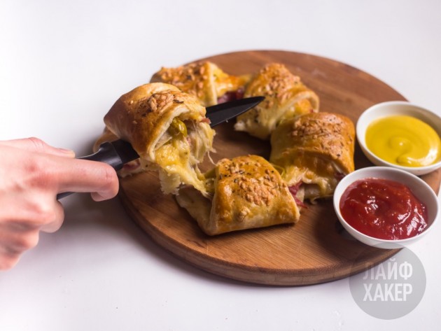 Мало кто способен удержаться от горячей выпечки с обилием тягучего сыра (пицца тому доказательство). Учитывайте этот факт, готовясь к вечеринке или посиделкам в компании. Мы предлагаем свою альтернативу — большую слойку-кольцо с ветчиной и сыром, для приготовления которой потребуется всего пять ингредиентов и совсем немного времени.