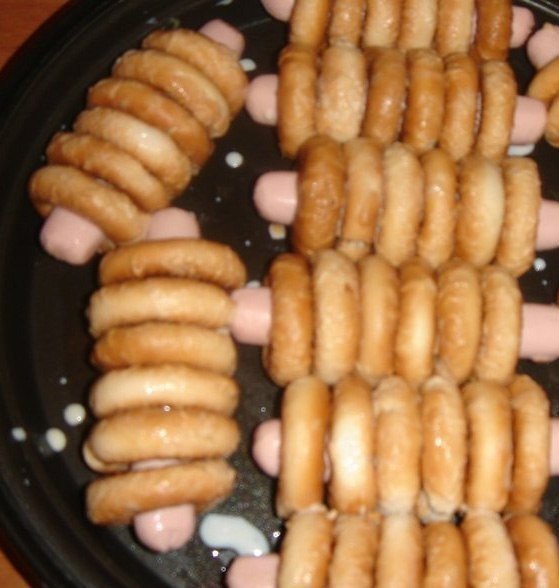 2. Когда сушки достаточно размокнут, необходимо одеть их на сосиски, предварительно каждую сосиску слегка смазать горчицей.Края сосисок должны выглядывать, так как при тепловой обработке они немного уменьшатся в длину.Уложить этих гусениц в огнеупорную форму