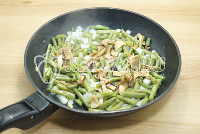 Фасоль выложить на сковороду с растительным маслом и готовить 2-3 минуты.