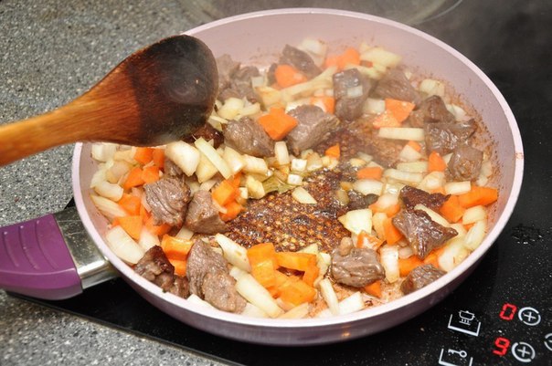 Мясо разрезать на порционные куски. Выложить в сковороду с разогретым маслом и обжарить на сильном огне около 10 минут.
