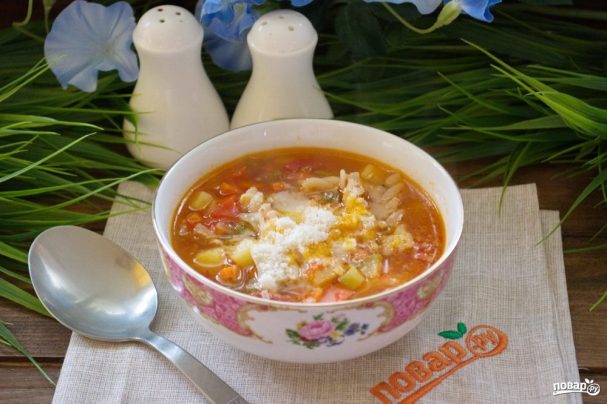 Суп посолите, поперчите. Добавьте итальянских травок и специй. Выключите. Разлейте суп по мискам. В каждую миску добавьте жменьку натертого пармезана.