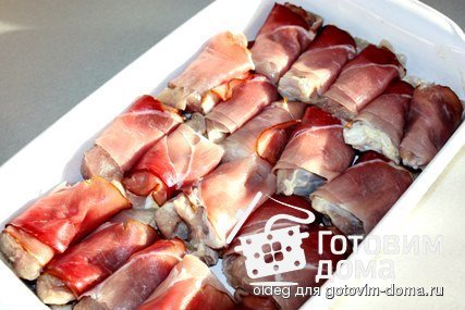 Мясо нарезаем небольшими кусками. Я обычно ориентируюсь на количество ветчины, сколько полосок ветчина, столько ломтиков мяса нарезаю. Каждый кусочек мяса заворачиваем в ветчину.
