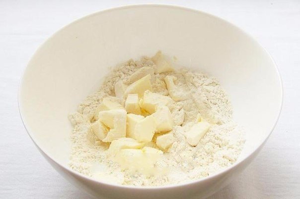 2. Холодное масло порубить ножом вместе с мукой.