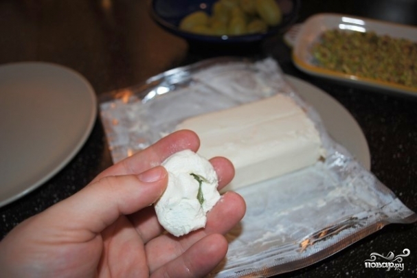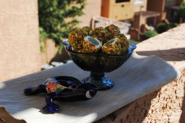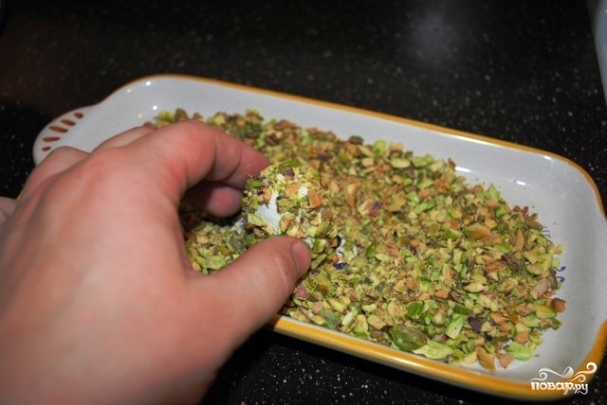 Теперь необходимо хорошенько обвалять наши шарики в фисташках, чтобы сыр и ореховая крошка схватились. Затем ставим шарики минут на 20-30 в холодильник, чтобы скрепились плотнее.