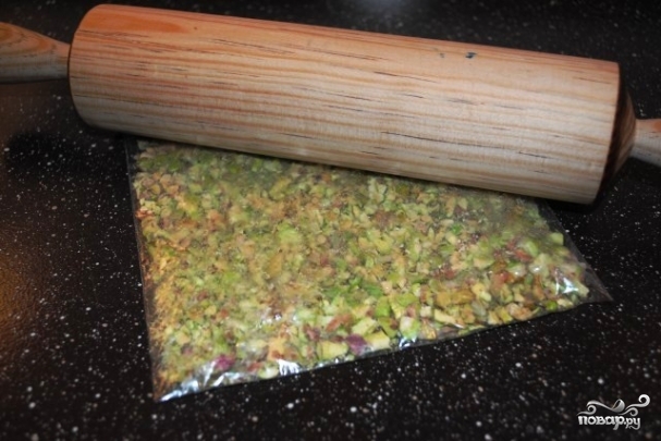 Далее необходимо превратить фисташки в крупную крошку. Можно делать это процессором или еще как-то, а я делаю дедовским методом - складываю фисташки в пакетик...