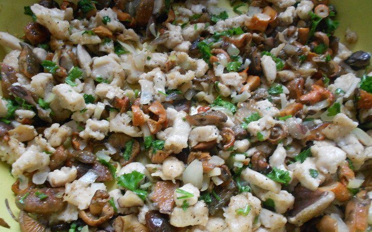 1.Отваренные грибы нарезать. Петрушку вымыть, перебрать, обсушить и нарезать.
