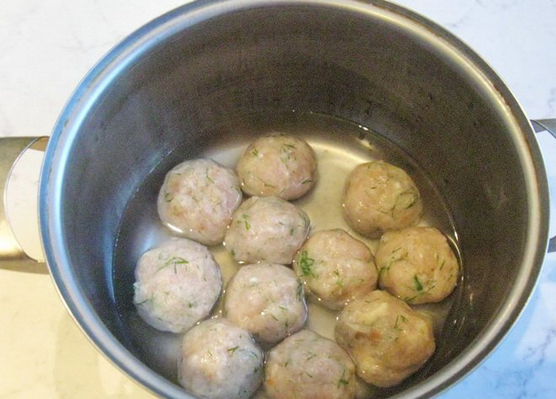 Формируем из фарша небольшие тефтельки, перекладываем их в кастрюлю. Вливаем немного воды, и варим тефтели на медленном огне 15 минут.