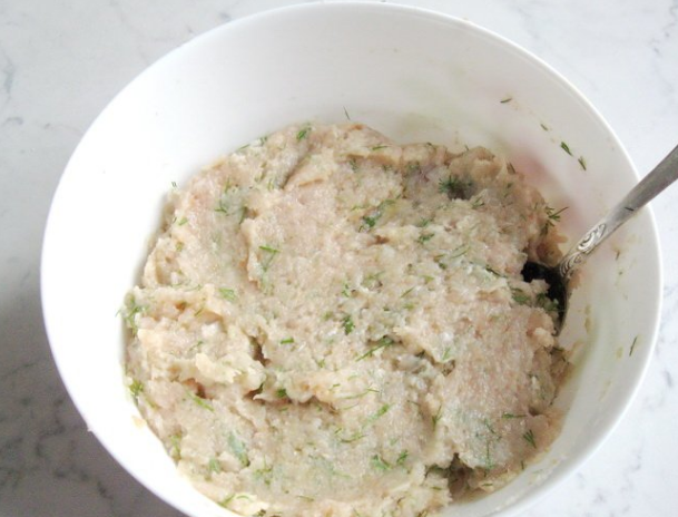 В глубокую тарелку кладем куриный фарш, вымоченный и отжатый белый батон, а также измельченный лук. Перемешиваем ингредиенты с помощью блендера.