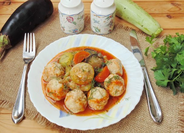 Тефтели с баклажаном и кабачком в томатном соусе — это сытное, полезное и вкусное блюдо. Фарш, из которого приготовлены тефтели, может быть из любого мяса по вашему вкусу. Готовится блюдо просто.