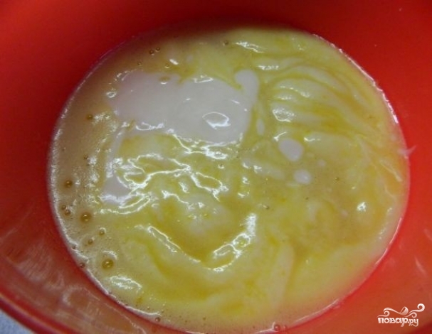 4. К яйцам добавьте остывшее масло. Как следует перемешайте.
