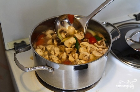 Добавляем грибы и рыбный соус. Варим 4-5 минут.