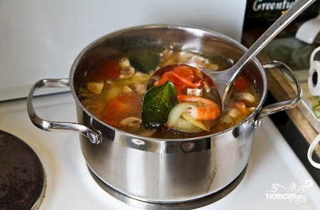 Как только креветки поменяют свой цвет на красный - выключаем плиту. Даем супу минут 4-5 настояться, и подаем к столу. Зелень кинзы добавляем в тарелки с супом.