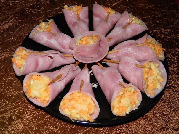 Ветчину порежьте тонкими пластинами. Из каждой пластинки сверните кулечек- колокольчик и заколите его шпажкой (я использовала зубочистки). Натрите на мелкой терке сырую морковь, сыр и чеснок. Все перемешайте и заправьте майонезом. Наполните этим салатом колокольчики. В середину колокольчика по желанию можно положить кусочек оливки или капельку кетчупа, что больше вам нравится.