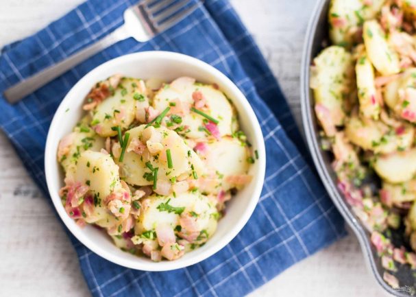 Классический картофельный салат готовится с беконом, зеленью, луком и, конечно, крупно нарезанным картофелем. Записывайте и вы рецепт приготовления идеального картофельного салата.