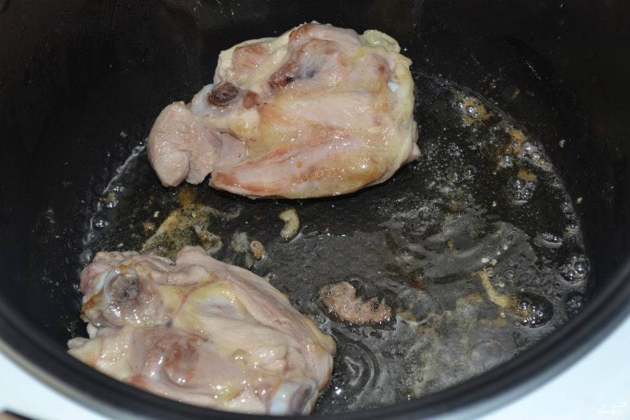 Утиные части выложите в чашу мультиварки, добавьте подсолнечное масло. Включите режим глубокой обжарки на 20 минут, готовьте 10 минут.