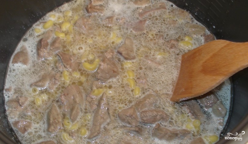 Влейте воду, она должна покрыть макароны и печень.