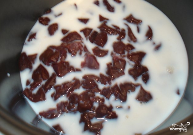 Влейте молоко (у меня было приблизительно 160 мл.). Крышку лучше не закрывать полностью, т.к. печень нужно помешивать.
