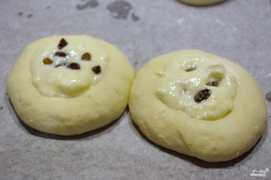 В твороге "утопите" изюминки. Это скорее декор, чем наполнение ватрушки. Края ватрушки нужно смазать взбитым желтком.
