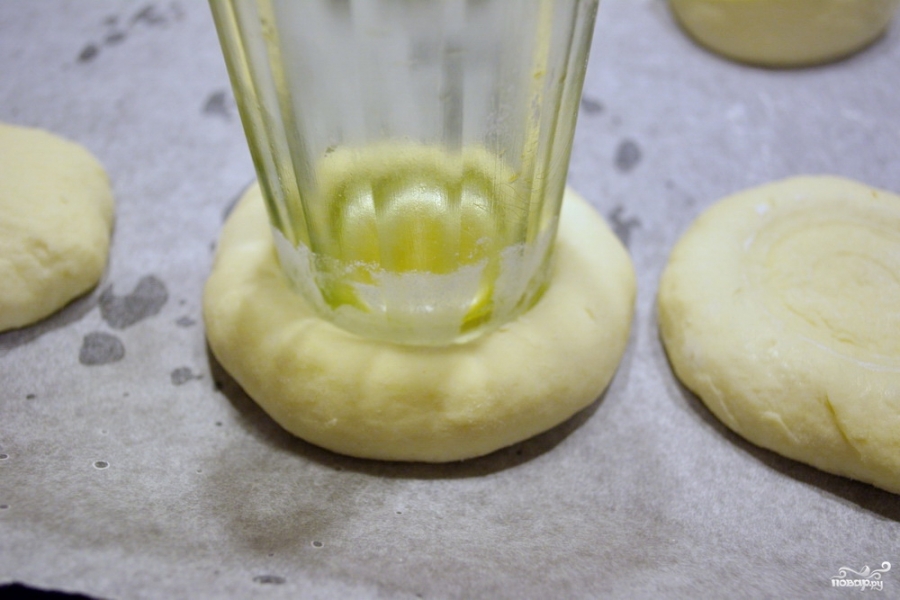 Дно стакана смочите в растительном масле, в каждой лепешке сделайте стаканом углубления.