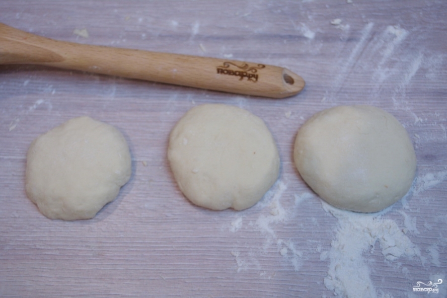 Тесто разделите на небольшие кусочки. Каждый кусочек скатайте в шарик и слегка приплюсните.