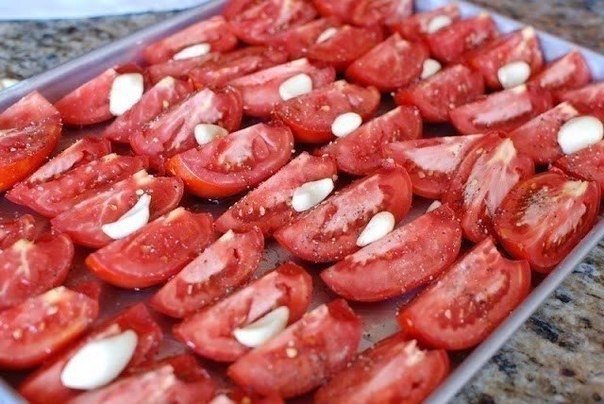 Главное, к чему вам следует подготовиться: томаты томятся в духовке 10 часов при низком нагреве. Благодаря этой технологии соки из томатов выходят медленно, постепенно смешиваясь с ароматами чеснока и оливкового масла. Не самое быстрое блюдо, но, поверьте, невероятно вкусное и ароматное!