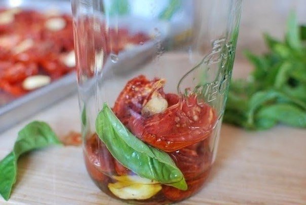 6. Возьмите литровую банку и налейте в нее немного оливкового масла, чтобы было на самом дне. Добавьте немного печеных томатов, пару листиков базилика и чеснок, который запекался вместе с томатами. Снова полейте оливковым маслом и продолжайте, пока баночка не наполнится.