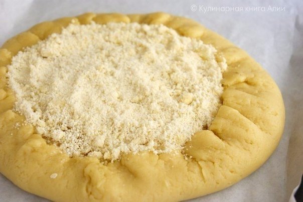 5. Тесто раскатать в круг толщиной 0,5 см. Выложить начинку, отставая от края на 1,5 см.